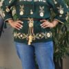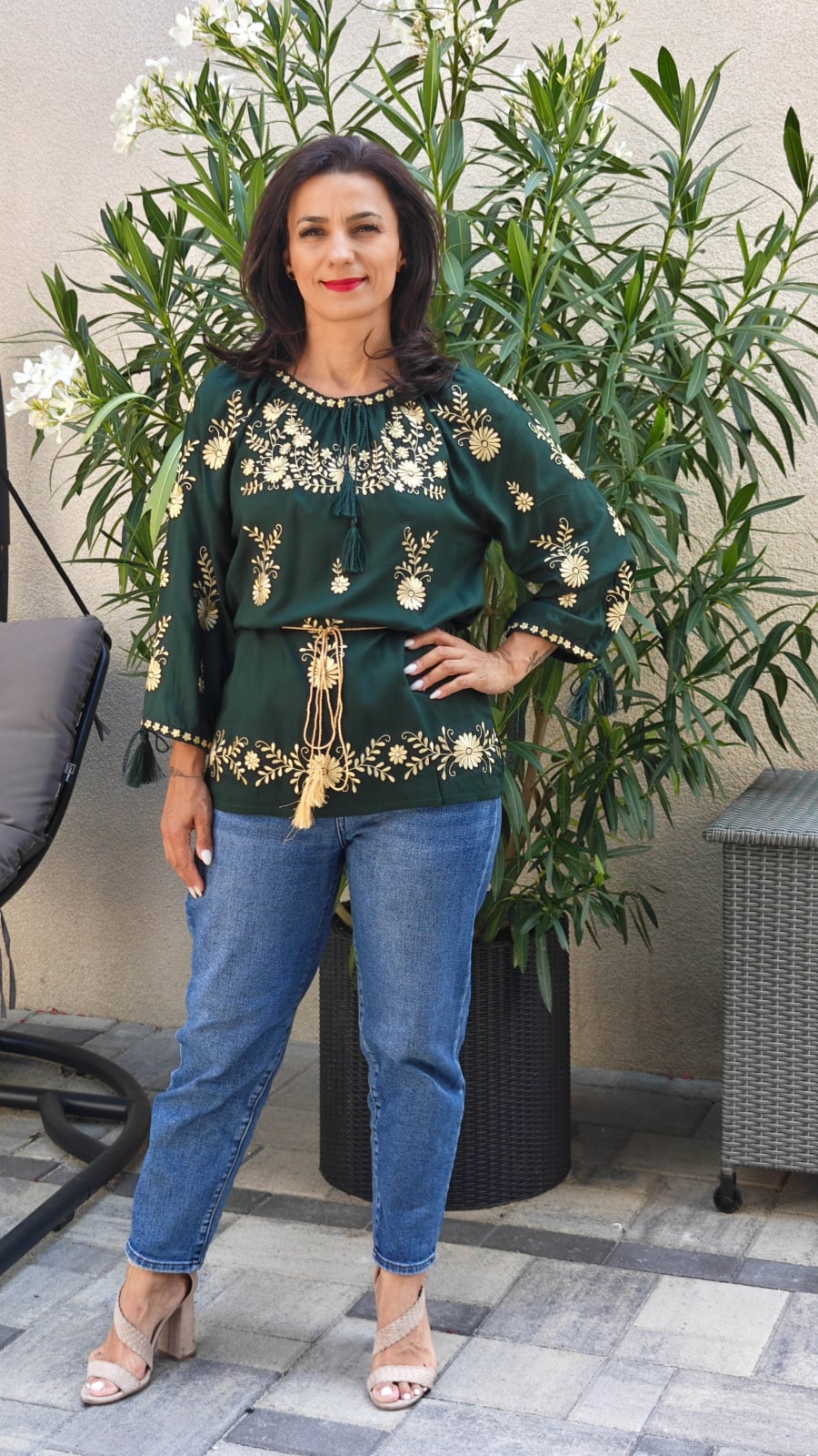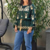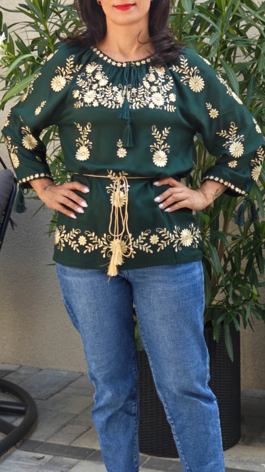 ✔️Bluza verde cu broderie florala aurie, confectionata din rayon.