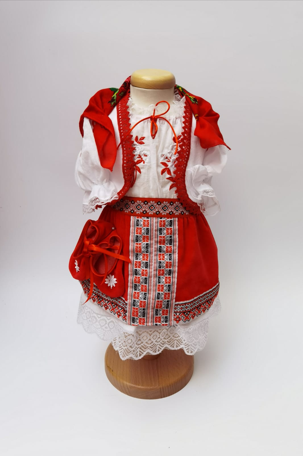 Compleul este compus din: ie traditionala cu dantele, fusta cu fota in fata, vesta, traista, batic.