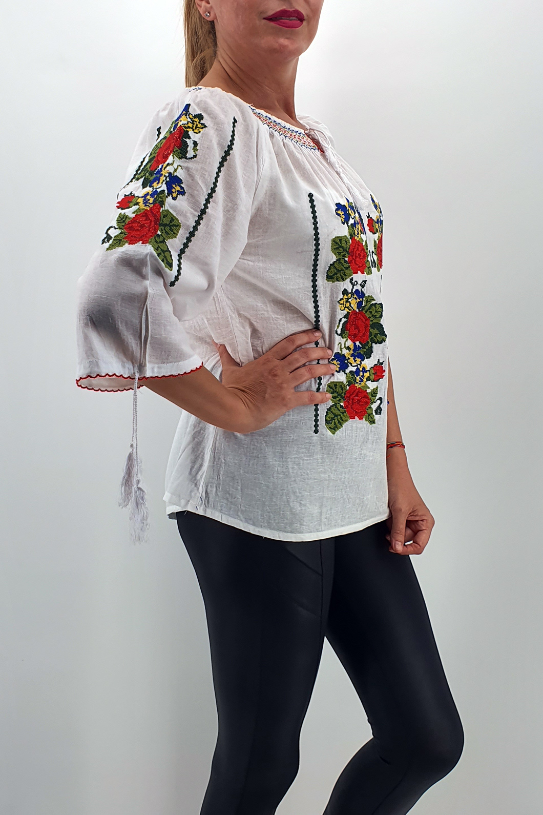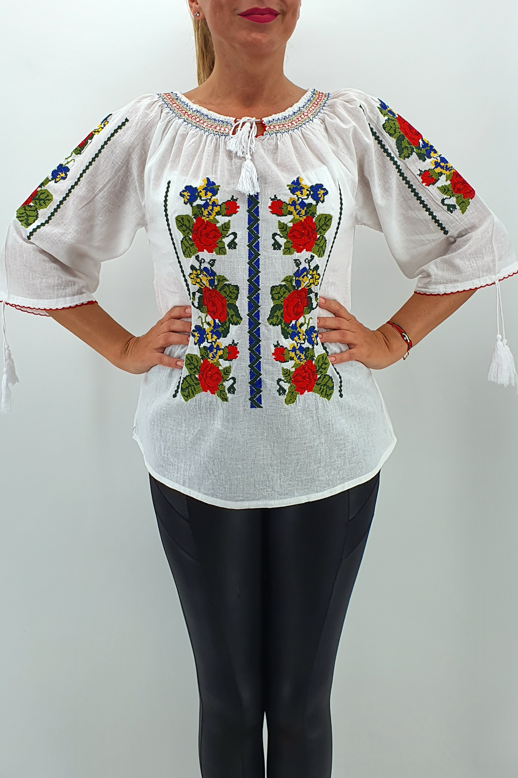 Culoare: alb cu broderie rosie, verde, albastra si neagra